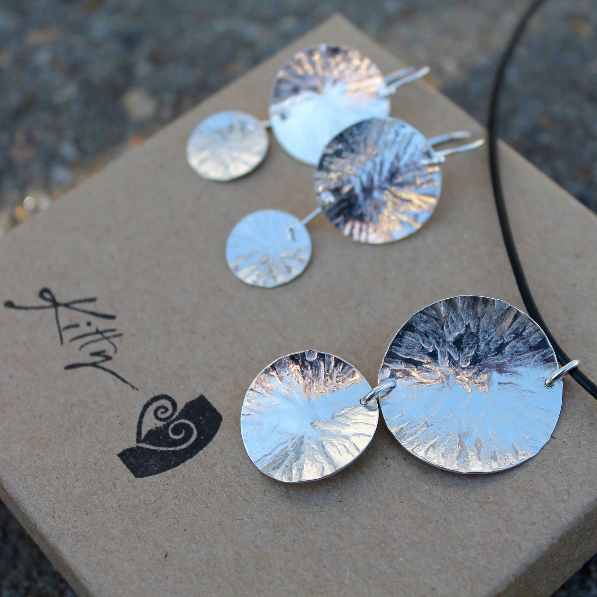 These Double Circle earrings are hand textures and tumble hardened with a high shine. Also Available in a Matte/Satin finish. Please email me if you need them in a post style instead of french hooks.