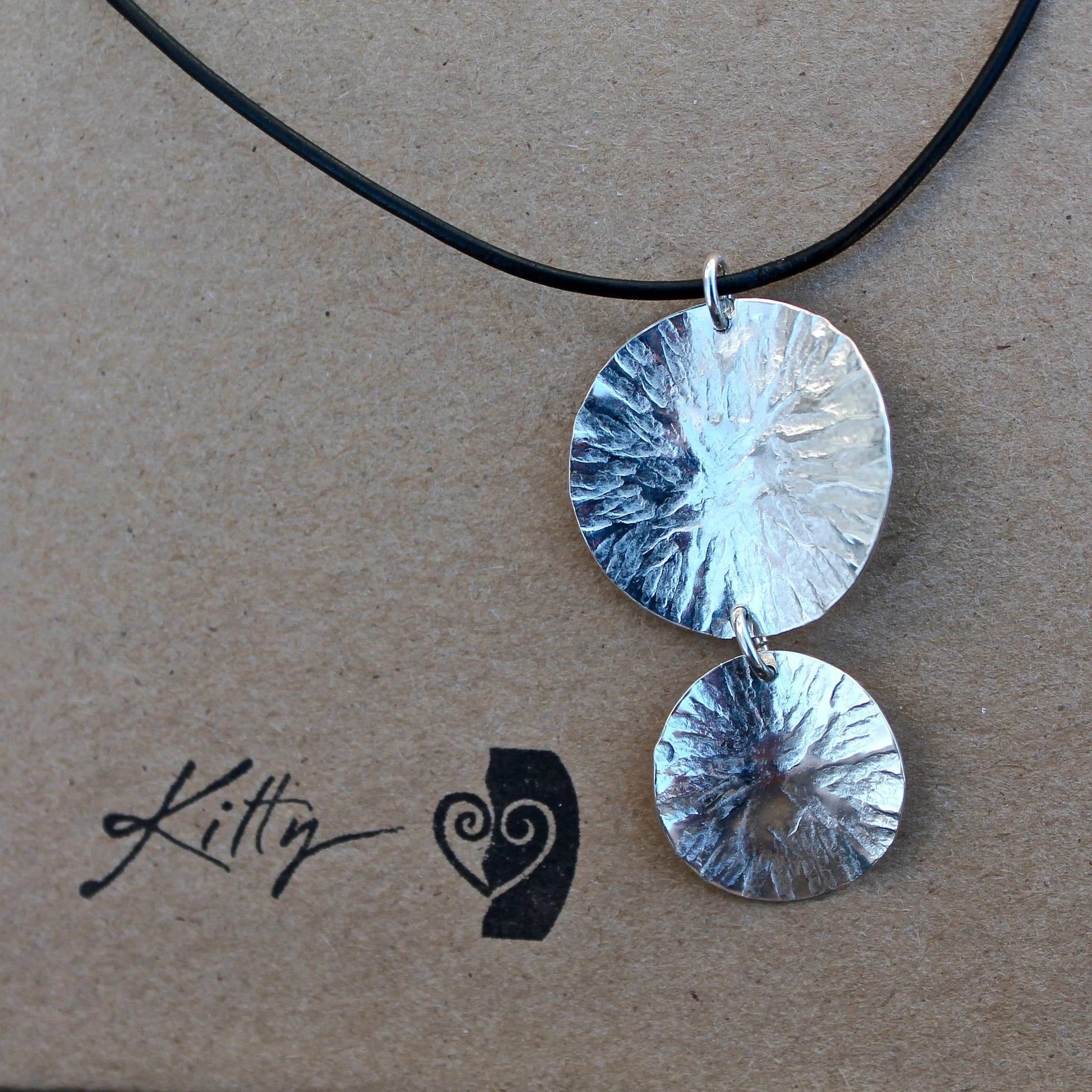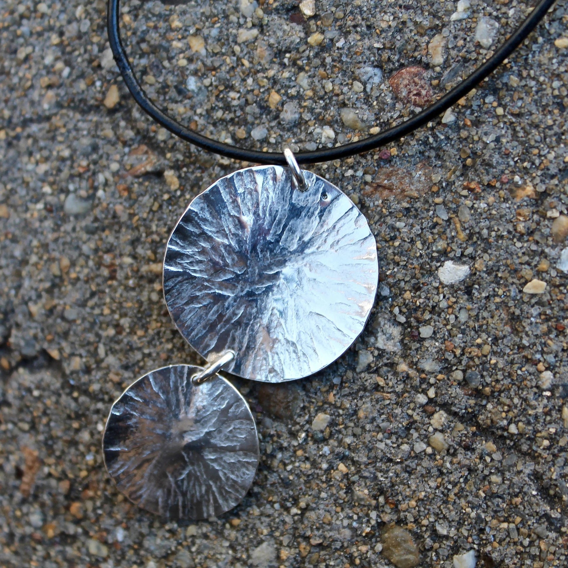 I hand texture these double circle Necklace. Measure 2” long and 1” wide and really stand out and is lightweight. Black 18" leather with sterling clasp.