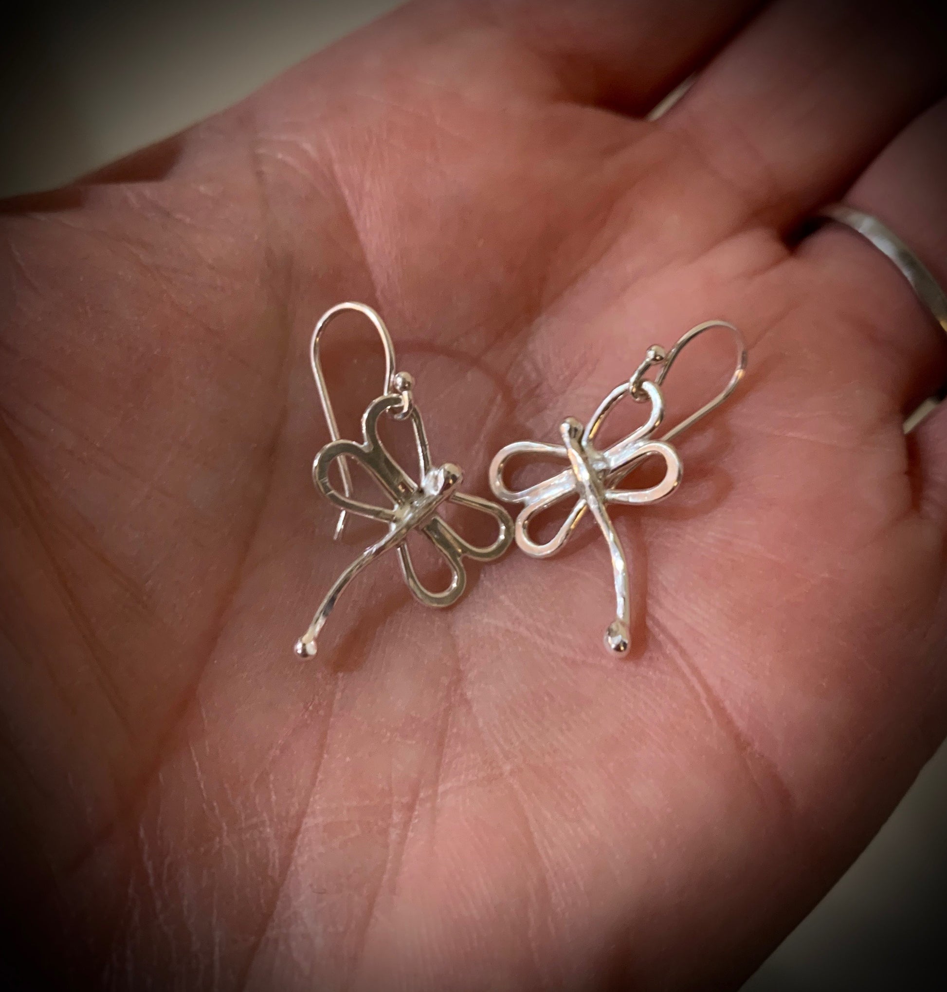 These Dragonfly earrings are so beautiful on....they look like they are in flight... I handcrafted these small dragonfly earrings from sterling silver. All of the dragonflies that I make are completely handmade one at a time, giving each one a special look. The texture that I added to this pair is both flared at the wings and hammered lightly on the body into the tail. Shiny finish and measure about 3/4 inches from the top of the wing to the tip of the tail