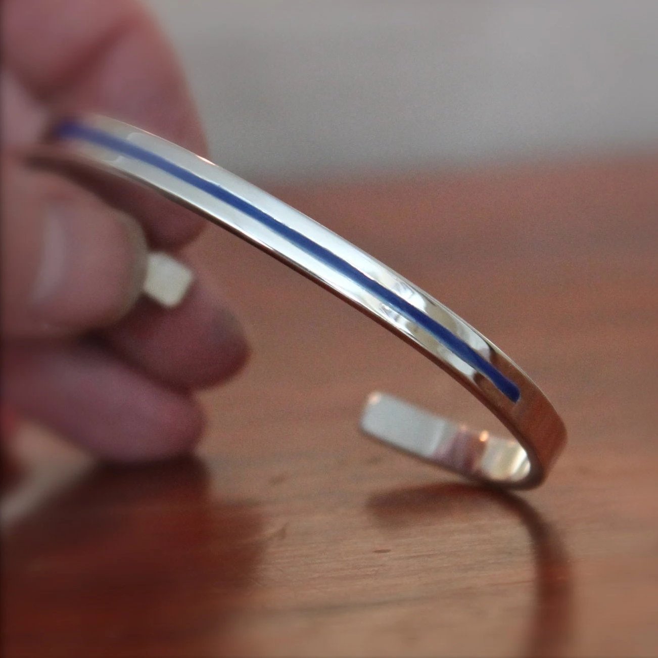 "Thin Green Line" cuff Bracelet is sterling silver and can be hand stamped with a custom name or initials and badge number inside, with a heart, or no personalization. Please choose the option from the choices at checkout.